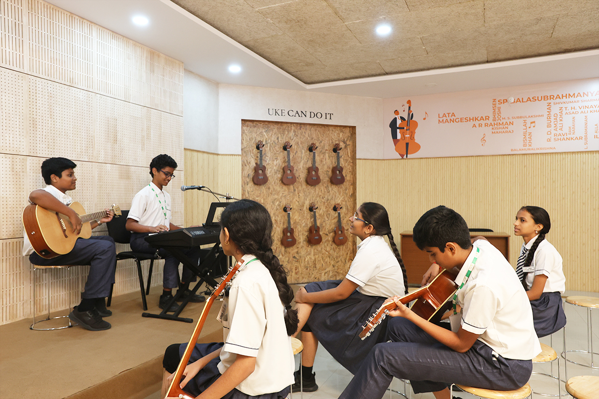 At Arbor International School, our state-of-the-art Music Room is a vibrant space where creativity meets discipline. Designed to inspire budding musicians, the room is equipped with a wide range of instruments including keyboards, guitars, drums, tabla sets, and a full percussion kit. Acoustically treated walls and sound-isolated practice zones allow students to explore vocal and instrumental music in an immersive environment. Whether it's classical, contemporary, or world music, our curriculum encourages self-expression and collaborative performance through regular practice sessions, recitals, and inter-school competitions. The Music Room serves as both a learning studio and a creative hub—nurturing talent, confidence, and a lifelong appreciation for the arts.